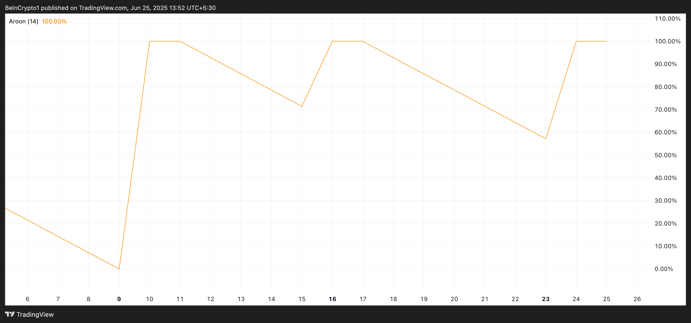 เมื่อเส้น Aroon Up อยู่ที่ 100% สินทรัพย์ได้ถึงจุดสูงสุดล่าสุดภายในช่วงเวลาที่กำหนด โดยทั่วไปคือ 25 ช่วงเวลา นี่คือกรณีของ SYRUP ซึ่งได้บันทึกจุดสูงสุดใหม่ที่ $0.6195 ในช่วงการซื้อขายของวันนี้