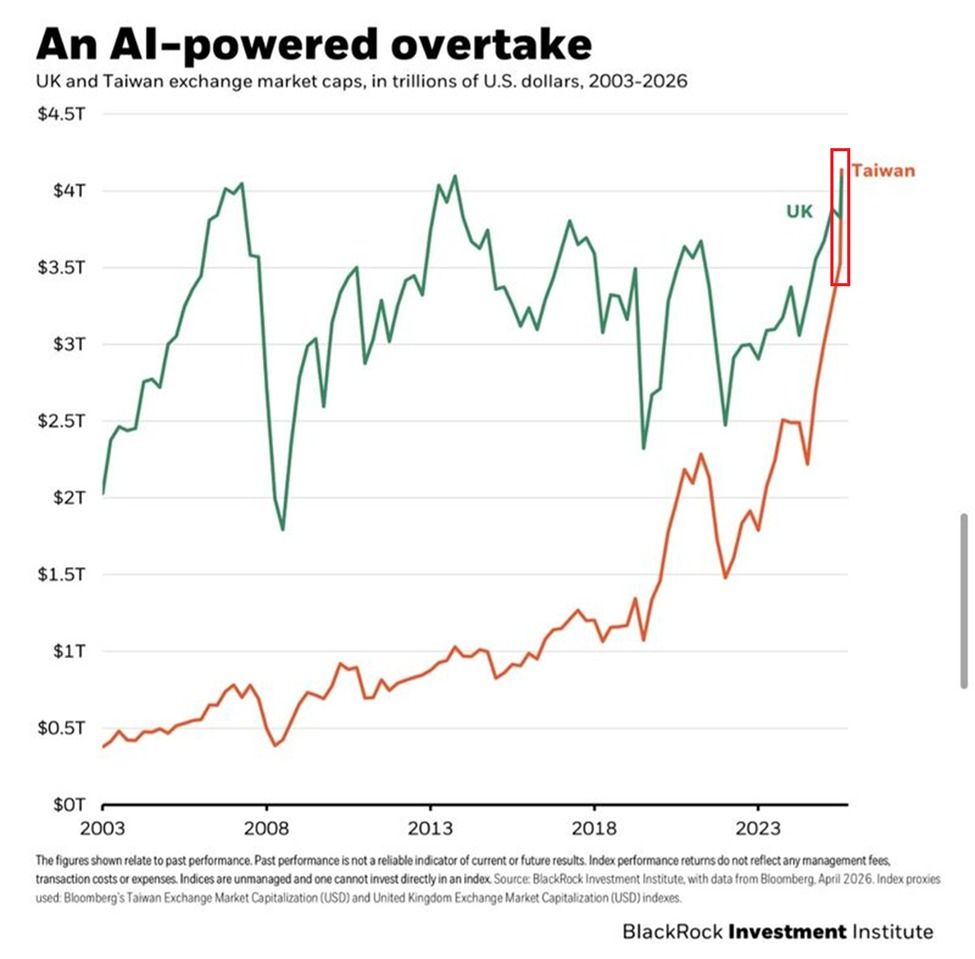 The Kobeissi Letter เน้นย้ำว่าตลาดหุ้นไต้หวันพุ่งแตะ 4.14 ล้านล้าน USD ในเดือนนี้ แซงหน้าสหราชอาณาจักรที่ 4.09 ล้านล้าน USD ขึ้นมาเป็นตลาดที่มีขนาดใหญ่เป็นอันดับเจ็ดของโลก