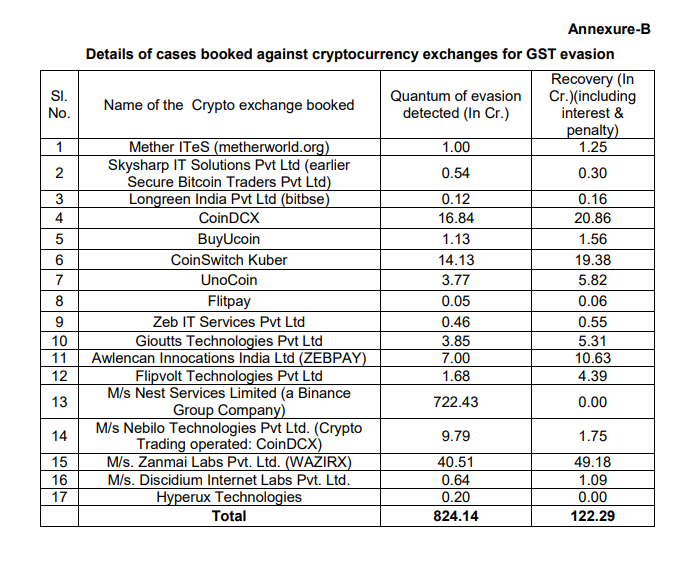 รัฐบาลอินเดียได้เปิดเผยหนี้สินภาษีสินค้าและบริการ (GST) ที่ยังไม่ได้ชำระจากการแลกเปลี่ยนสกุลเงินดิจิทัล รวมถึง Binance และ WazirX