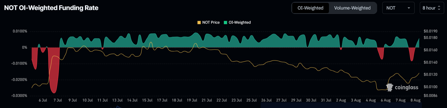 ในทางตรงกันข้าม อัตราการระดมทุนของ Notcoin แกว่งไปมาระหว่างค่าลบและค่าบวก ความผันผวนนี้ชี้ให้เห็นถึงความไม่แน่นอนอย่างต่อเนื่องและความเชื่อมั่นของนักลงทุนที่หลากหลายเกี่ยวกับทิศทางในอนาคตของเหรียญ
