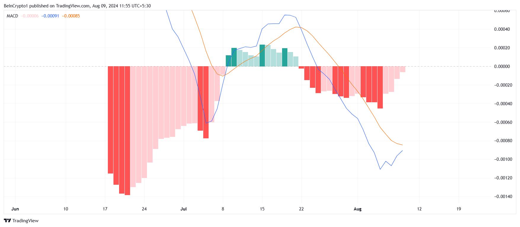 ตัวบ่งชี้ MACD ของ Notcoin กําลังแสดงโมเมนตัมขาลงที่ลดลง สิ่งนี้อาจนําไปสู่การครอสโอเวอร์ขาขึ้นในอนาคตอันใกล้ การเปลี่ยนแปลงที่อาจเกิดขึ้นนี้อาจบ่งบอกถึงจุดเริ่มต้นของแนวโน้มเชิงบวกสําหรับเหรียญโทรเลขเมื่อตลาดเริ่มฟื้นตัว