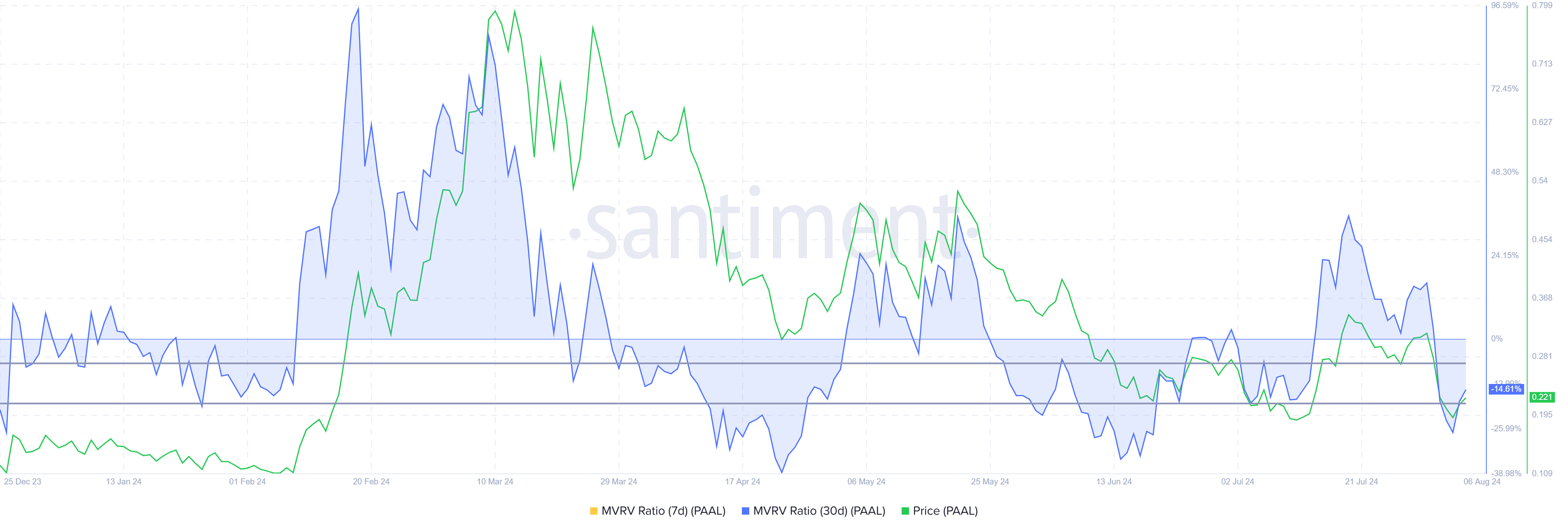 ปัจจุบัน MVRV 30 วันของ PAAL AI อยู่ที่ 10% ซึ่งบ่งชี้ถึงการขาดทุนและ แรงกดดันในการซื้อที่อาจเกิดขึ้น ในอดีต PAAL MVRV ระหว่าง -8% ถึง -18% มักจะส่งสัญญาณถึงการเริ่มต้นของการฟื้นตัวหรือการชุมนุม ทําให้เป็นพื้นที่ที่ดีสําหรับการสะสมและถูกระบุว่าเป็นโซนโอกาส