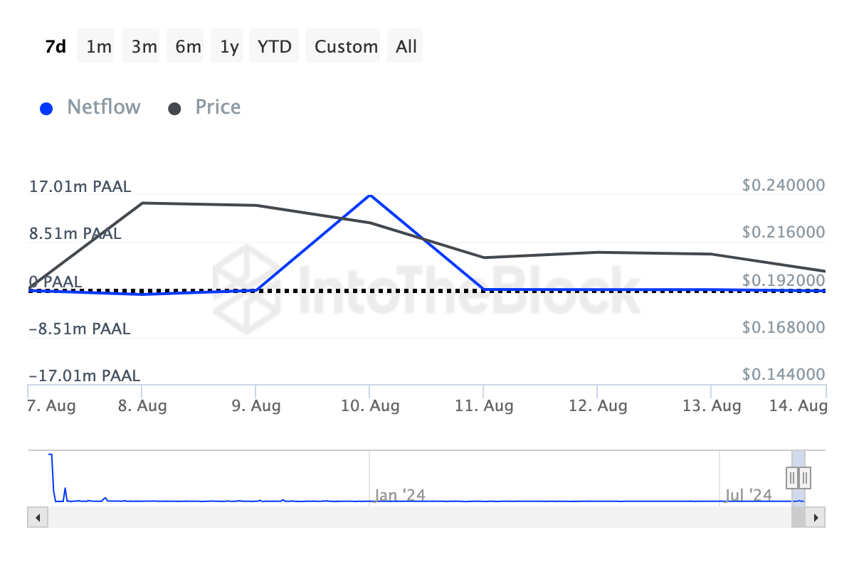 จากข้อมูลของ IntoTheBlock กระแส สุทธิของผู้ถือรายใหญ่ของ PAAL AI ลดลง 72% ในช่วงเจ็ดวันที่ผ่านมา และยังคงเป็นเช่นนี้ในช่วง 30 ถึง 90 วันที่ผ่านมา กระแสสุทธิของผู้ถือครองขนาดใหญ่คือความแตกต่างระหว่าง การไหลเข้าและการไหลออก