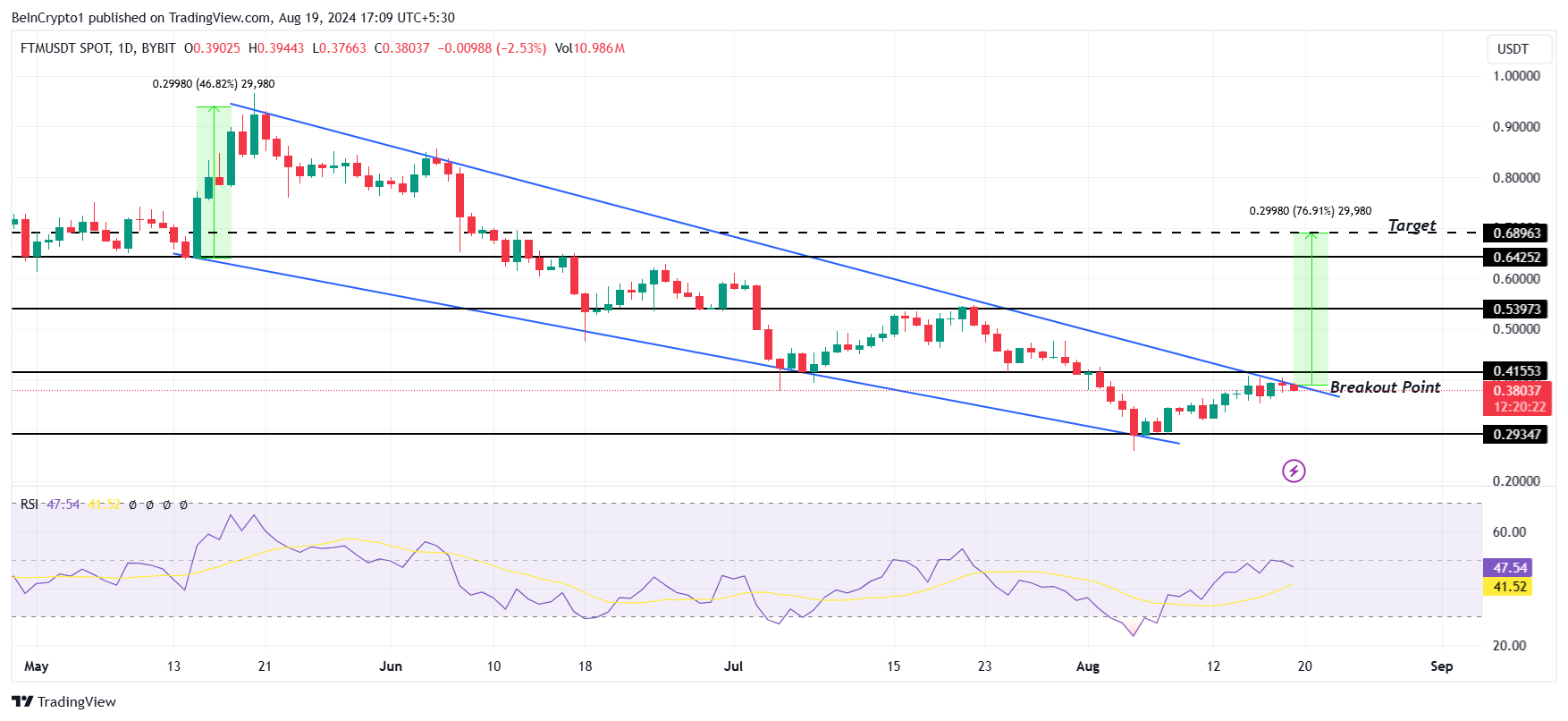 รูปแบบขาขึ้นนี้บ่งชี้ถึงศักยภาพที่เพิ่มขึ้น 77% สําหรับ FTM หลังจากการทะลุของ altcoin สิ่งนี้ทําให้ เป้าหมายสําหรับ FTM อยู่ที่ 0.68 ดอลลาร์ แม้ว่าราคาของ Fantom อาจไม่ถึงจุดนี้ แต่ก็อาจเพิ่มขึ้นเป็น 0.50 ดอลลาร์