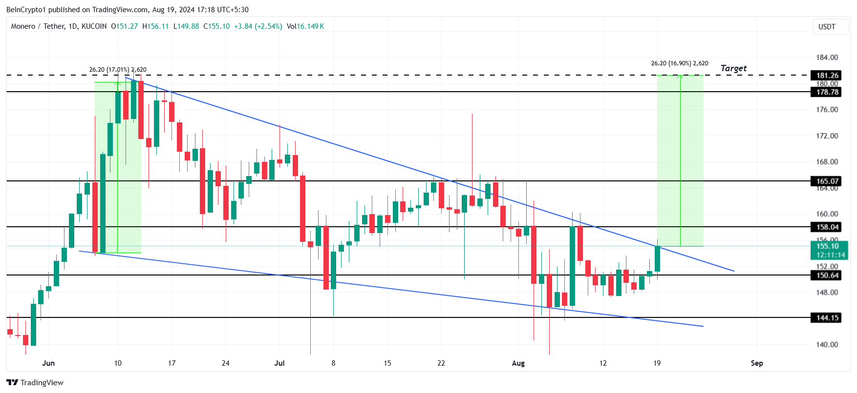 ราคาของ Monero กําลังเป็นไปตาม รูปแบบลิ่มจากมากไปน้อยที่คล้ายคลึงกับ Fantom และใกล้จะฝ่าวงล้อม รูปแบบขาขึ้นชี้ให้เห็นว่า XMR อาจสังเกตเห็นการเพิ่มขึ้นเกือบ 17% หากทะลุได้สําเร็จ