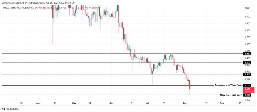 ATL ก่อนหน้านี้ที่ $1.00 เกือบจะเป็นโมฆะเมื่อวานนี้ แต่ระดับต่ําสุดระหว่างวันหยุดที่ $1.01 อย่างไรก็ตาม นี่ไม่ใช่กรณีในวันจันทร์ เนื่องจาก DYDX ร่วงลงเพื่อสร้าง ATL ใหม่ที่ 0.86 ดอลลาร์