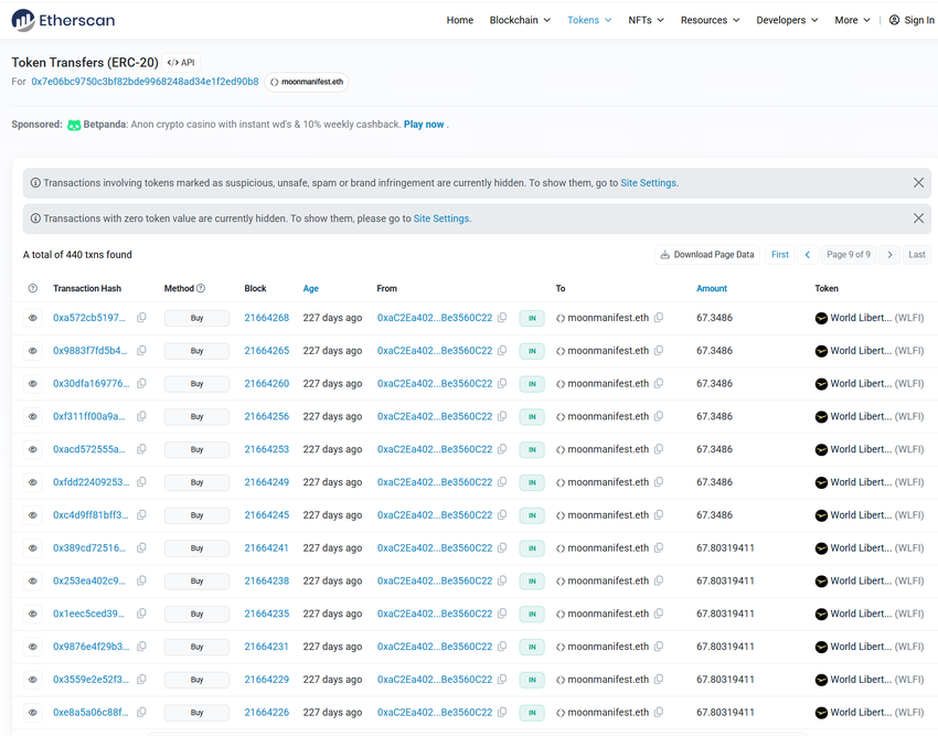ในเย็นวันจันทร์ WLFI เริ่มทำการซื้อขายบนตลาดแลกเปลี่ยนคริปโตระดับโลก ทำให้ค่าธรรมเนียมแก๊สของ Ethereum พุ่งสูงเกิน 100 Gwei เป็นครั้งแรกในรอบหลายเดือน ที่อยู่กระเป๋าเงิน moonmanifest.eth ซึ่งถือโทเค็น WLFI หนึ่งพันล้านโทเค็น เริ่มอ้างสิทธิ์ในส่วนแบ่งของตน