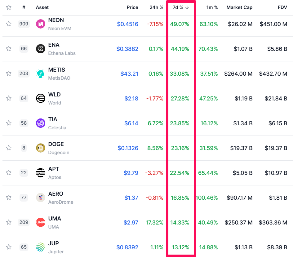 30 จาก 35 altcoins มีสัปดาห์ที่เติบโต, ยกเว้น Kaspa (KAS) และ Helium (HNT) ที่มีการลดลงอย่างน่าสังเกต -4% และ -7.4% ตามลำดับ