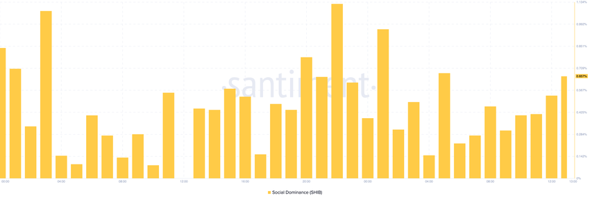 จากข้อมูลของ Santiment Shiba Inu สังเกตเห็นการครอบงําทางสังคมที่เพิ่มขึ้น ในคริปโต การครอบงําทางสังคมหมายถึงอัตราการอภิปรายเกี่ยวกับสินทรัพย์เมื่อเทียบกับสกุลเงินดิจิทัลอื่นๆ ใน 100 อันดับแรก