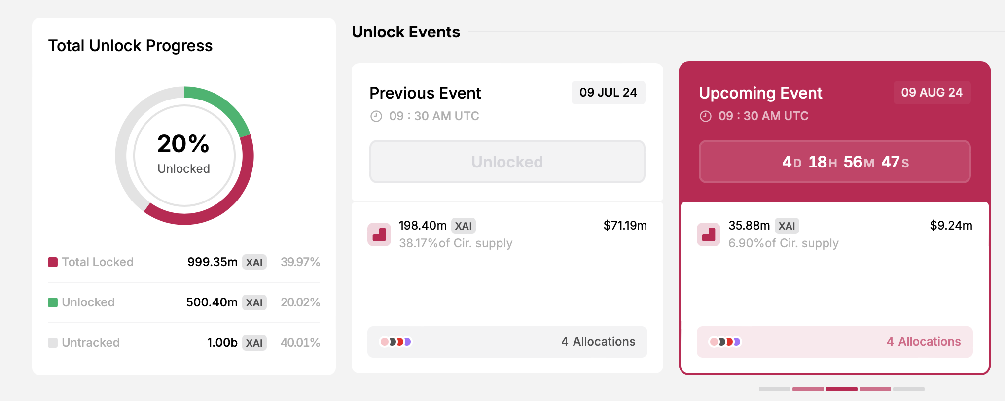 ในวันที่ 9 สิงหาคม โครงการจะปลดล็อค Token XAI จํานวน 35.88 ล้าน Token โดยแจกจ่ายให้กับทีมงาน นักลงทุน ทุนสํารอง และระบบนิเวศน์
