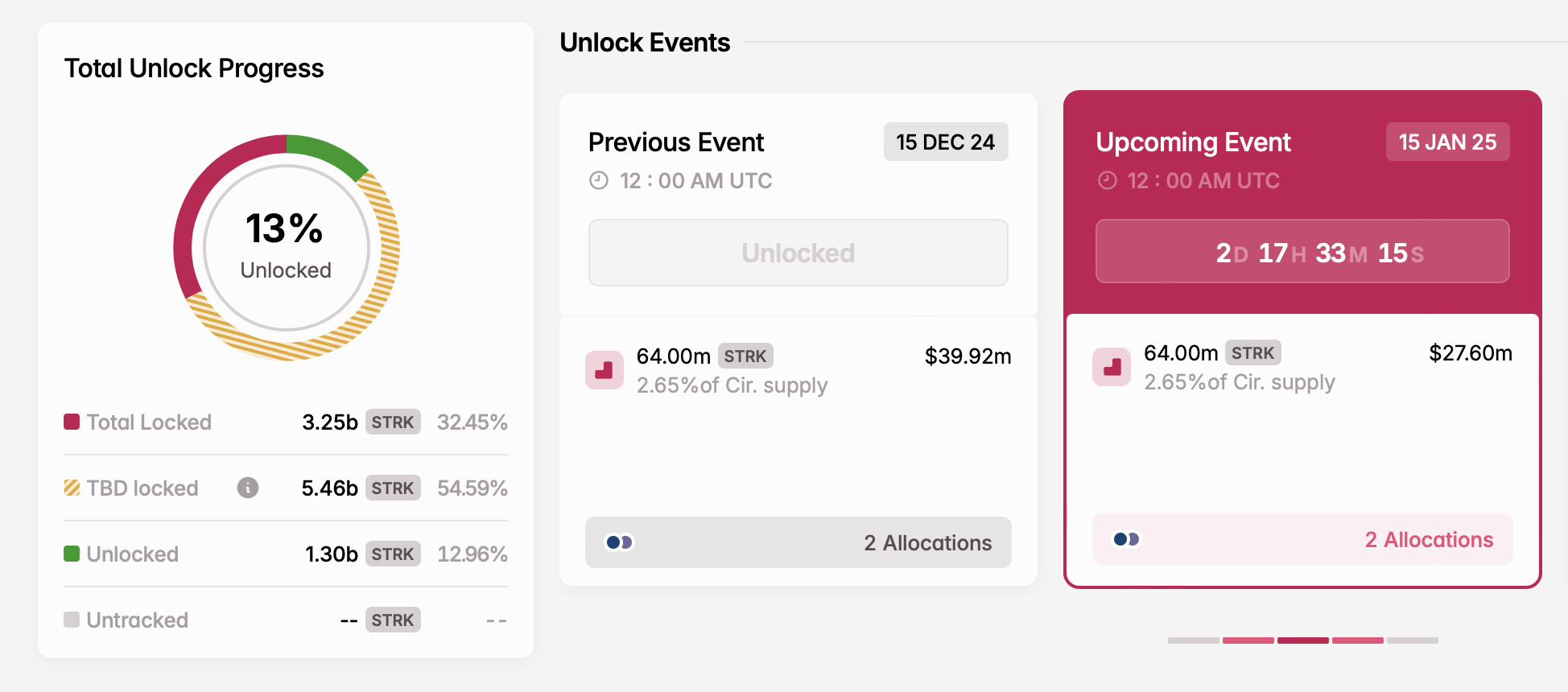 ในวันที่ 15 มกราคม โครงการจะปลดล็อกโทเคน STRK จำนวน 64 ล้านโทเคน โดยจัดสรรให้กับนักลงทุนและผู้ร่วมงานในช่วงแรก