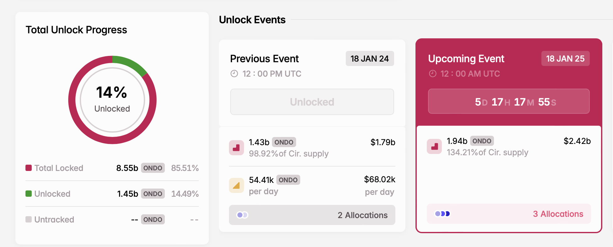 Ondo Finance ซึ่งเป็นโครงการ สินทรัพย์ในโลกจริง (RWA) วางแผนที่จะปลดล็อกโทเคนครั้งใหญ่ในวันที่ 18 มกราคม การปล่อยครั้งนี้มีมูลค่า 2.42 พันล้าน USD ซึ่งคิดเป็น 134.21% ของอุปทานหมุนเวียน โทเคนจะถูกจัดสรรให้กับผู้เข้าร่วมการขายส่วนตัว การเติบโตของระบบนิเวศ และการพัฒนาของโปรโตคอล