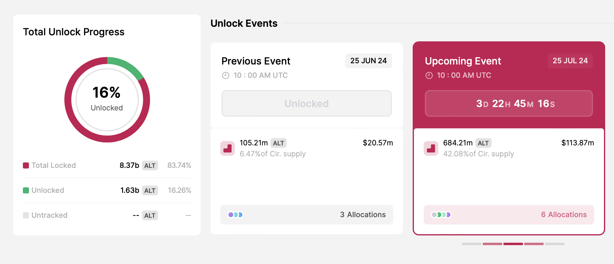 การปลดล็อกของ ALT คิดเป็น 84.5% ของการปลดล็อกหน้าผาทั้งหมดในอีกเจ็ดวันข้างหน้า เนื่องจากอุปทานหมุนเวียนของ ALT ค่อนข้างน้อยเมื่อเทียบกับอุปทานทั้งหมด การปลดล็อกโทเค็นจํานวนมากนี้อาจส่งผลเสียต่อราคา