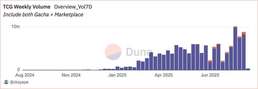 ข้อมูลบนบล็อกเชนยืนยันการเติบโตนี้ ตามข้อมูลจาก Raydium Protocol แพ็คโปเกมอนที่ถูกทำให้เป็นโทเค็นได้มียอดขายเกิน 70 ล้าน USD แล้ว รวมถึงสถิติ 5 ล้าน USD ใน 24 ชั่วโมง แดชบอร์ดของ Dune Analytics แสดงว่ามีการ์ดที่ถูกทำให้เป็นโทเค็นมากกว่า 17,000 ใบหมุนเวียนในตลาด