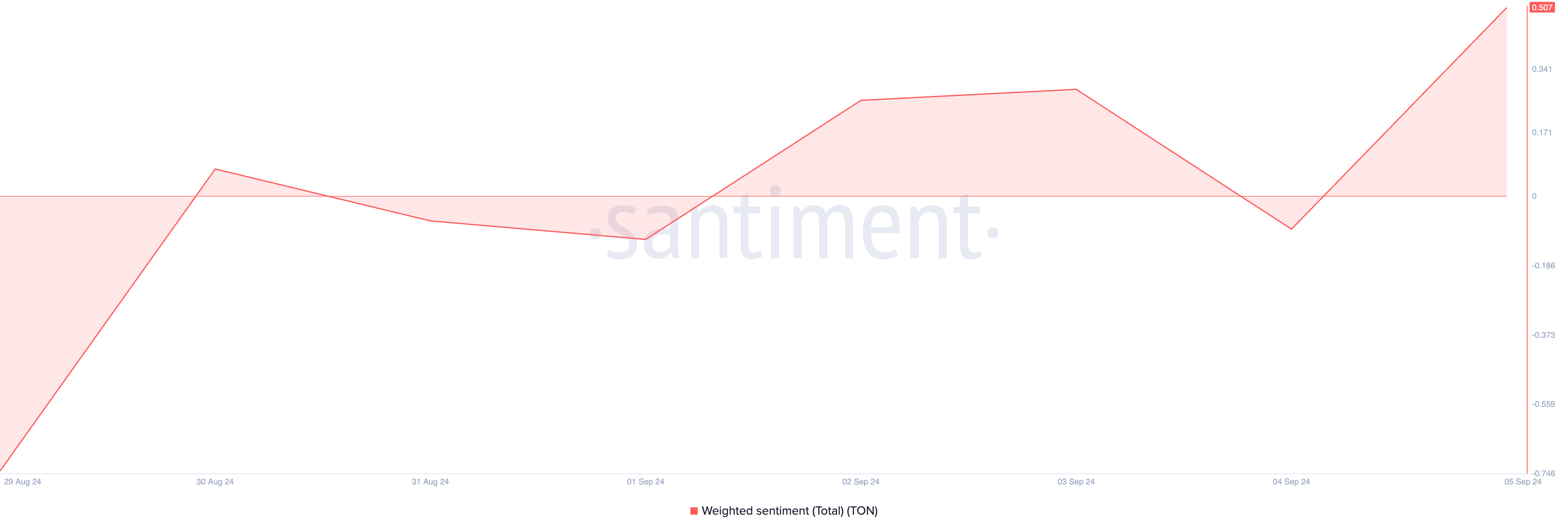 นอกจากนี้ อารมณ์ตลาดต่อ TON ได้เปลี่ยนจากลบเป็นบวกในช่วงสองวันที่ผ่านมา ตามที่แสดงโดยค่าความรู้สึกที่เป็นบวกของ altcoin นี้