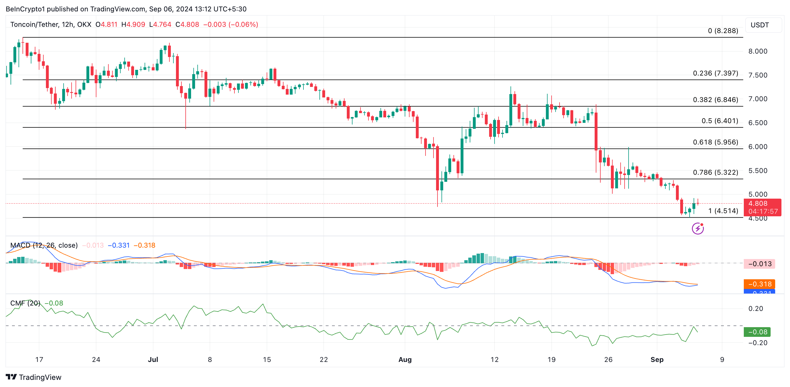 อย่างไรก็ตาม ผู้ค้าต้องระวังระดับต่ำสุดล่าสุดที่ USD 4.51 การสูญเสียระดับการสนับสนุนนี้อาจทำให้เกิดการแก้ไขราคา 40% สำหรับ Toncoin