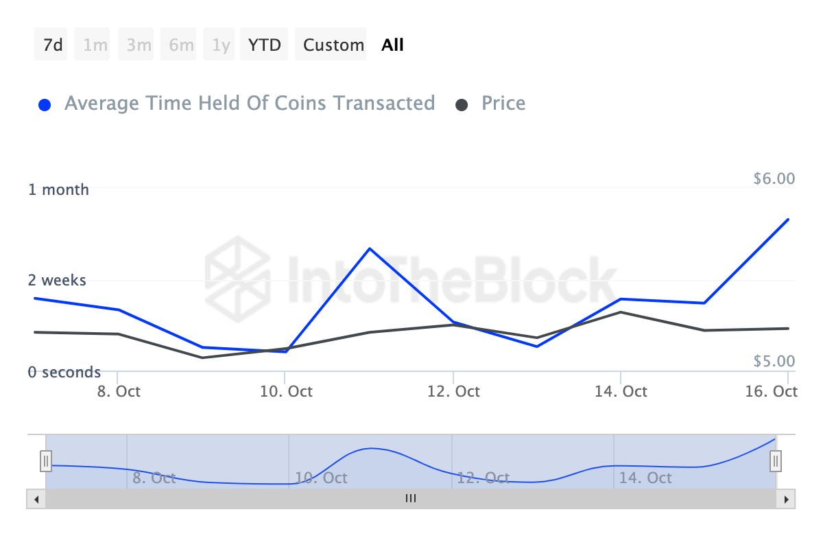 นอกจากการเพิ่มขึ้นของการไหลเข้าของเหรียญจากผู้ถือจำนวนมากแล้วเวลาการถือครองเหรียญของ Toncoin ก็เพิ่มขึ้นเช่นกัน ตัวชี้วัดนี้ติดตามระยะเวลาที่สกุลเงินดิจิทัลถูกถือโดยไม่มีการขาย ระยะเวลาการถือครองที่ยาวนานมักสะท้อนถึงความมั่นใจที่เพิ่มขึ้นว่าสินทรัพย์จะสร้างผลตอบแทนที่ดี
