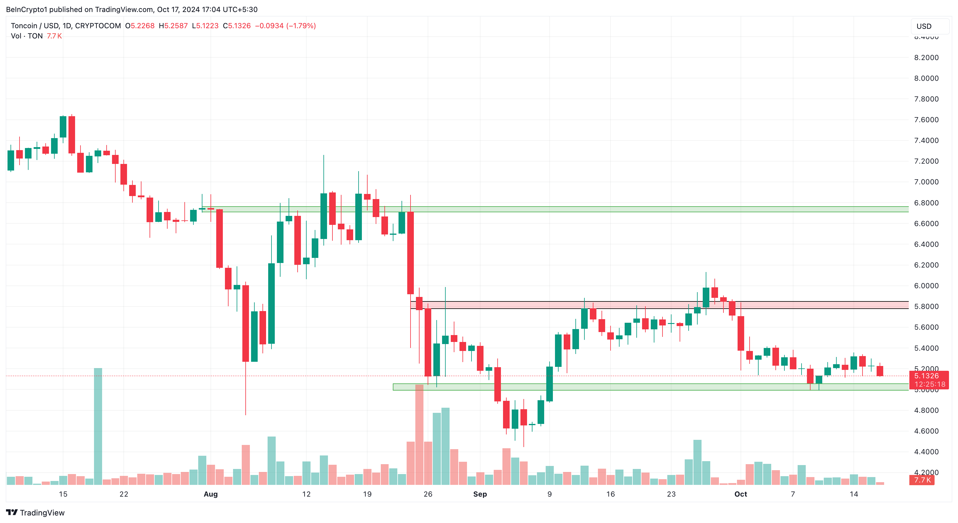 การดูกราฟรายวันแสดงให้เห็นว่าราคาของ Toncoin อยู่ที่ 5.13 ดอลลาร์ แม้ว่ามูลค่าปัจจุบันจะลดลง แต่ BeInCrypto สังเกตเห็นการสนับสนุนที่แข็งแกร่งที่ 5.05 ดอลลาร์ การสนับสนุนนี้ซึ่งในอดีตได้ป้องกัน TON จากการปรับตัวลดลงอย่างมาก อาจกลายเป็นสิ่งสำคัญอีกครั้ง