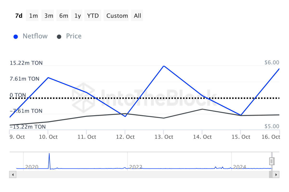 ตามข้อมูลจาก IntoTheBlock การไหลเข้าของเหรียญจากผู้ถือจำนวนมากของ Toncoin เพิ่มขึ้น 44% ในช่วงเจ็ดวันที่ผ่านมา ในโลก Crypto ผู้ถือจำนวนมากคือที่อยู่ที่ควบคุมประมาณ 1% ของปริมาณเหรียญที่หมุนเวียนทั้งหมดของ Token