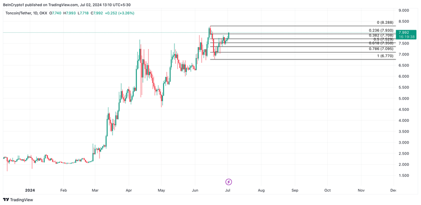 แม้ว่าหลายสกุลเงินดิจิทัลจะมีมูลค่าลดลงหลายเปอร์เซ็นต์ แต่ราคาของ Toncoin TON กลับเพิ่มขึ้น ณ เวลานี้ราคาอยู่ที่ 7.93 ดอลลาร์ โดยมูลค่าของมันเพิ่มขึ้น 24% ในเดือนที่ผ่านมา