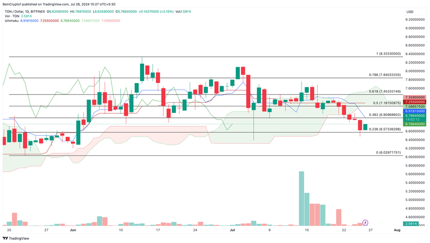 อย่างไรก็ตาม สําหรับ TON เมฆอยู่เหนือราคา ซึ่งบ่งชี้ถึงโมเมนตัมขาลง จากกราฟที่แสดงด้านล่าง ราคาของ Toncoin อาจลดลงเหลือ 6.57 ดอลลาร์ ซึ่งเป็นตําแหน่ง Fibonacci retracement 23.6%