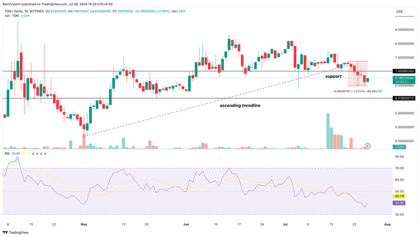 ระหว่างเดือนพฤษภาคมถึงวันที่ 21 กรกฎาคม TON สร้างเส้นแนวโน้มขาขึ้นซึ่งทําให้มั่นใจได้ว่าราคาจะไม่ทะลุต่ํากว่า 6.03 ดอลลาร์ อย่างไรก็ตาม ข้อมูลเวลากดที่แสดงในกราฟรายวันเผยให้เห็นว่าราคาได้เลื่อนลงต่ํากว่าเส้นแนวโน้มและแนวรับที่ 7.00 ดอลลาร์