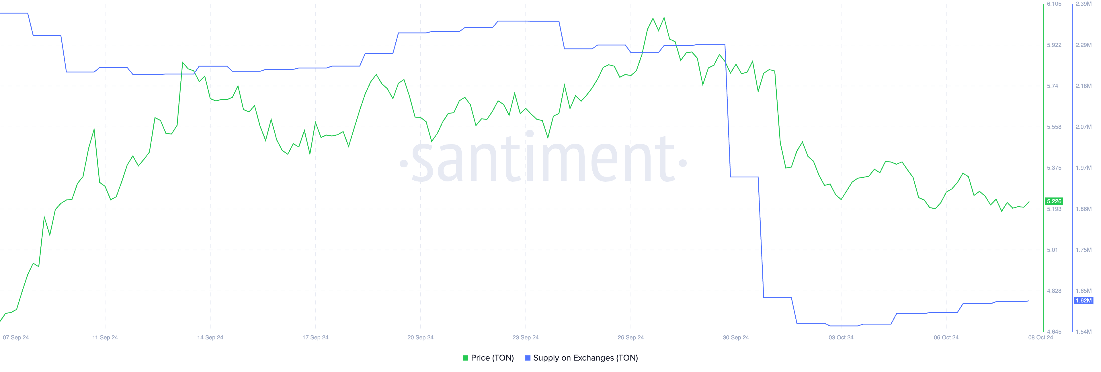 ระหว่างวันที่ 29 กันยายนถึง 2 ตุลาคม ปริมาณ TON ในตลาดแลกเปลี่ยนลดลงอย่างมาก จาก 2.29 ล้านลงไปเหลือ 1.56 ล้าน การลดลงอย่างมากนี้บ่งชี้ว่าผู้ถือหลายคนได้ถอนโทเค็นของพวกเขาออกจากตลาดแลกเปลี่ยน อาจย้ายไปยังกระเป๋าส่วนตัว ตั้งแต่นั้นมา ปริมาณในตลาดแลกเปลี่ยนได้เพิ่มขึ้นเล็กน้อย ตอนนี้อยู่ที่ 1.63 ล้าน
