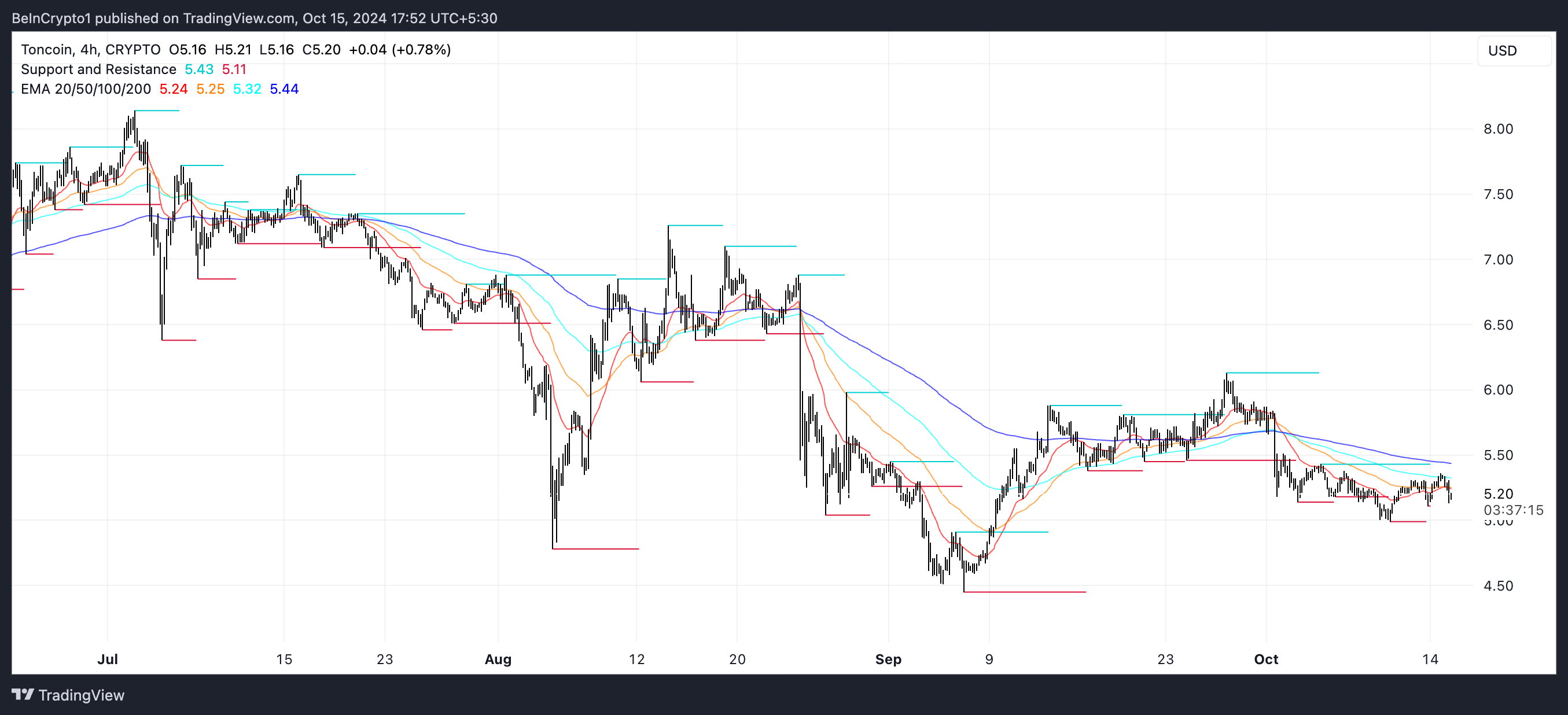 ในปัจจุบัน แนวโน้มของเส้น EMA ของ TON บ่งชี้ถึงแนวโน้มที่ไม่ดี โดยเส้นเฉลี่ยระยะสั้นอยู่ต่ำกว่าเส้นระยะยาว การจัดเรียงนี้มักบ่งบอกว่าแรงกดดันลงมีมากกว่า อย่างไรก็ตาม ระยะห่างระหว่างเส้น EMA ระยะสั้นและระยะยาวค่อนข้างน้อย บ่งชี้ว่าแนวโน้มที่ไม่ดีอาจไม่แข็งแกร่งนัก
