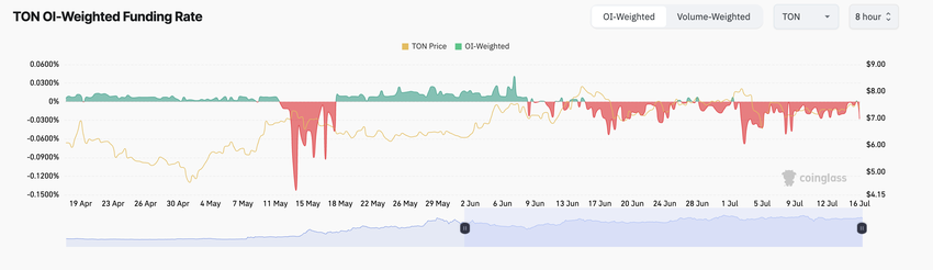 อย่างไรก็ตาม ไม่ใช่ทุกคนที่มองโลกในแง่ดีเหมือนวาฬ ในความเป็นจริง ตลาดอนุพันธ์ส่วนใหญ่ของ TON กําลังเดิมพันว่าราคาจะลดลงอย่างต่อเนื่อง สิ่งนี้สามารถรวบรวมได้จากอัตราการระดมทุนติดลบที่ตามหลัง altcoin ตั้งแต่วันที่ 15 มิถุนายน ในขณะที่เขียนนี้ อัตราการระดมทุนของ TON คือ -0.02%