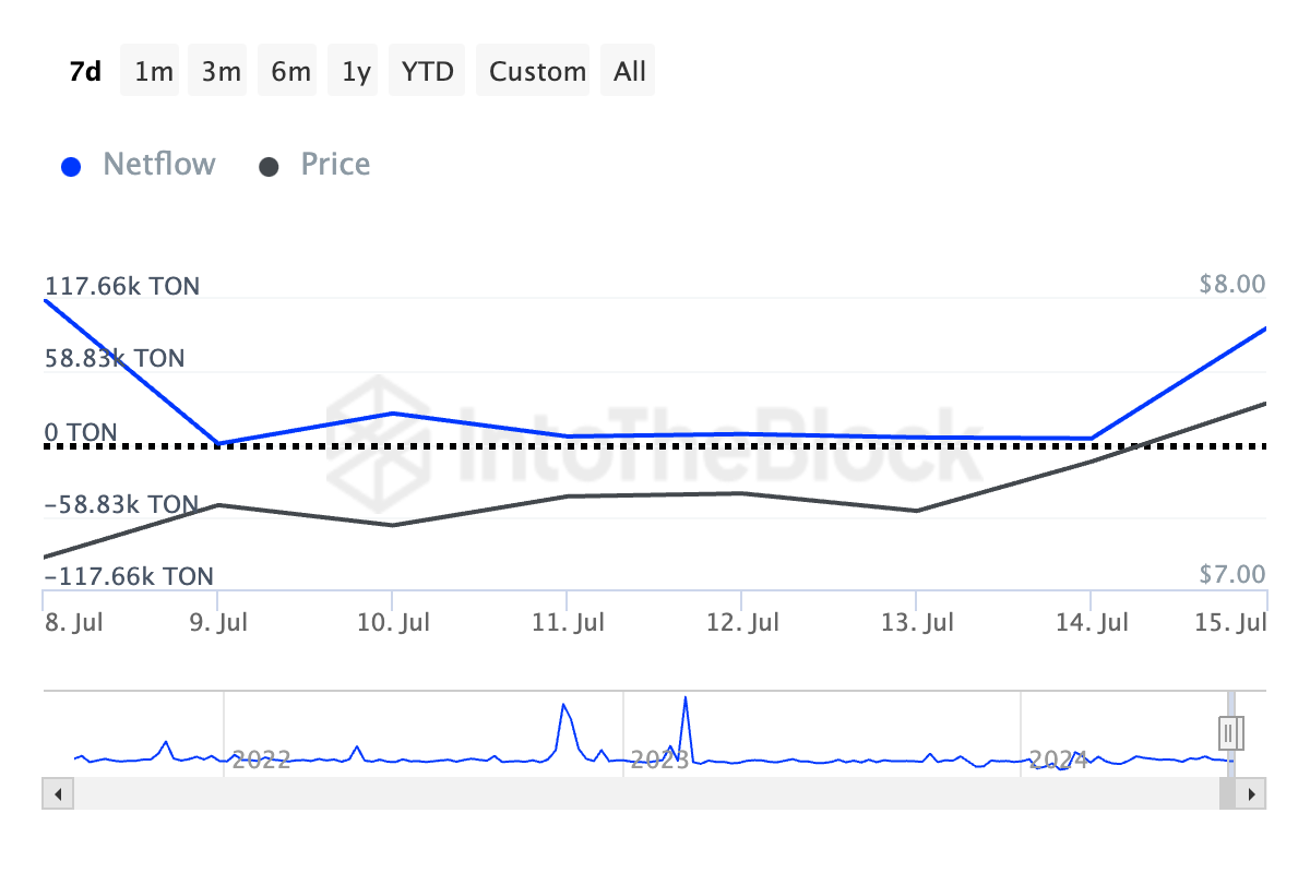 ข้อมูลจาก IntoTheBlock แสดงให้เห็นว่ากระแสสุทธิของผู้ถือครองรายใหญ่ของ Toncoin พุ่งขึ้นกว่า 31,000% ในช่วงเจ็ดวันที่ผ่านมา