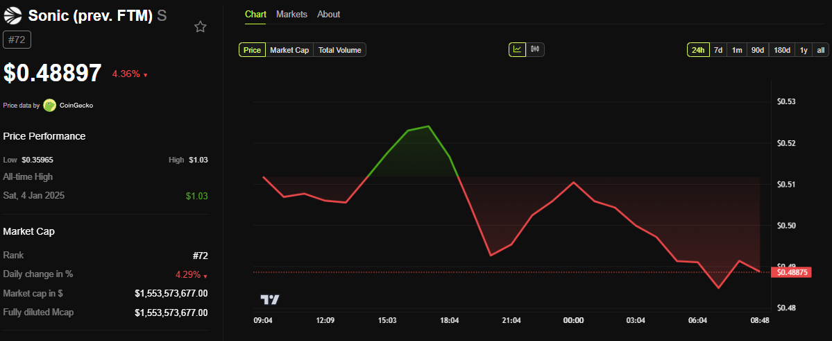 ข้อมูลจาก BeInCrypto แสดงให้เห็นว่าโทเค็น S ของ Sonic ซื้อขายอยู่ที่ USD0.48897 ลดลงกว่า 4% ใน 24 ชั่วโมงที่ผ่านมา