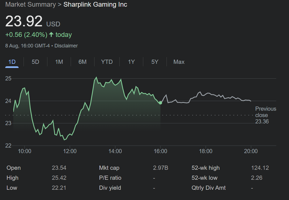 ข้อมูลจาก Google Finance แสดงให้เห็นว่าหุ้น SBET ของ Sharplink Gaming ซื้อขายอยู่ที่ 23.92 USD ณ เวลานี้ เพิ่มขึ้น 0.56% ก่อนตลาดเปิด