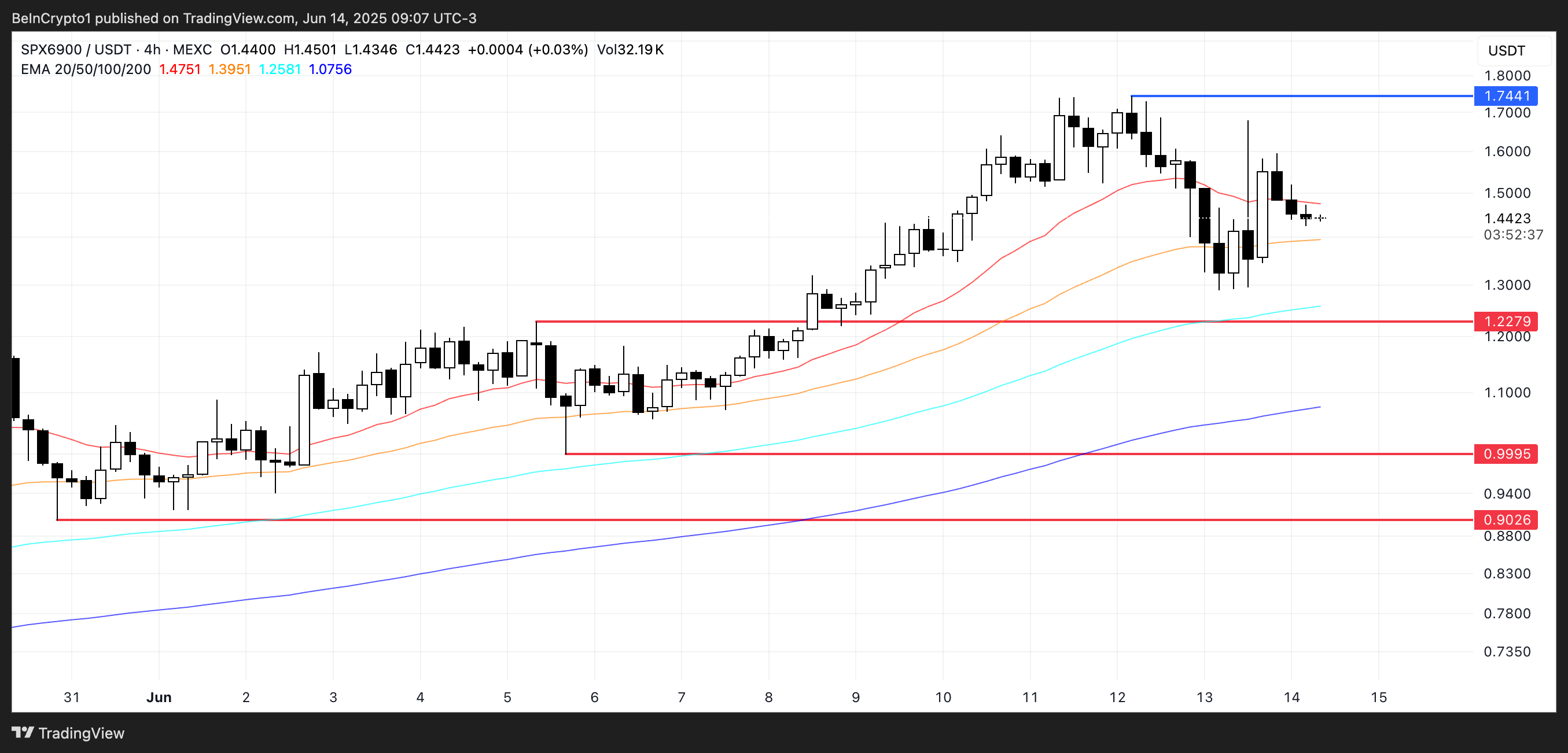 สิ่งนี้บ่งชี้ถึงการอ่อนตัวของแรงผลักดันขาขึ้น ทำให้ระดับสนับสนุนที่ 1.22 USD เป็นโซนสำคัญที่ต้องจับตามอง หากระดับนั้นแตก ราคาสามารถถอยกลับไปที่ 0.99 USD และอาจถึง 0.90 USD