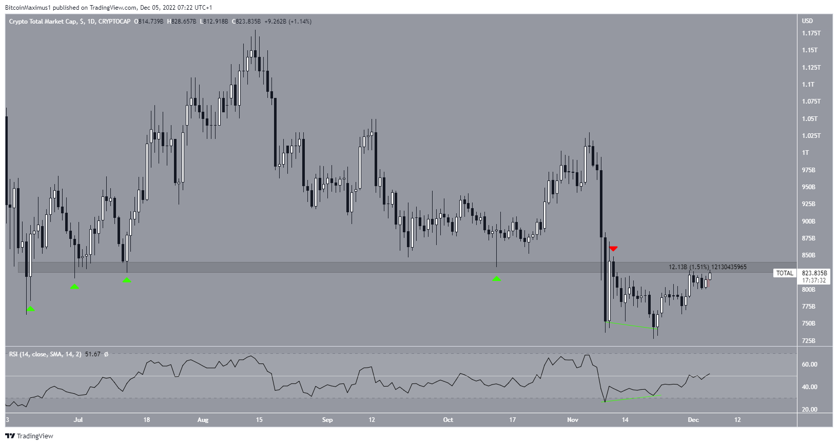 มูลค่าตลาดรวมของวงการคริปโตเคอเรนซี (TOTALCAP) เพิ่มขึ้น 1.5% ในวันที่ 4 ธันวาคม และกลับมาเพิ่มขึ้นอีกครั้งในช่วงเช้าของวันที่ 5 ธันวาคม 2022