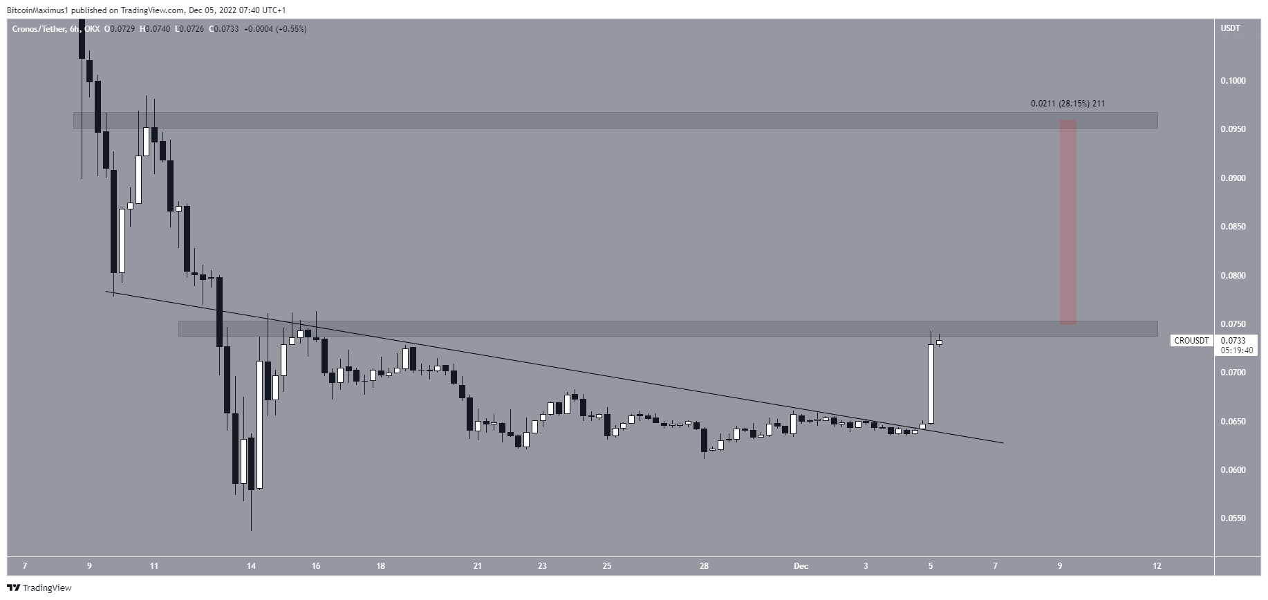 ราคาของ Cronos (CRO) ทะลุออกจากแนวต้านขาลงในวันที่ 4 ธ.ค. ก่อนหน้านี้ เส้นดังกล่าวอยู่ในตำแหน่งตั้งแต่วันที่ 14 พ.ย. การฝ่าวงล้อมนำไปสู่การเคลื่อนไหวขาขึ้นอย่างรวดเร็วหลังจากนั้น โดยนำ CRO ไปที่แนวต้าน 0.0745 ดอลลาร์สหรัฐ