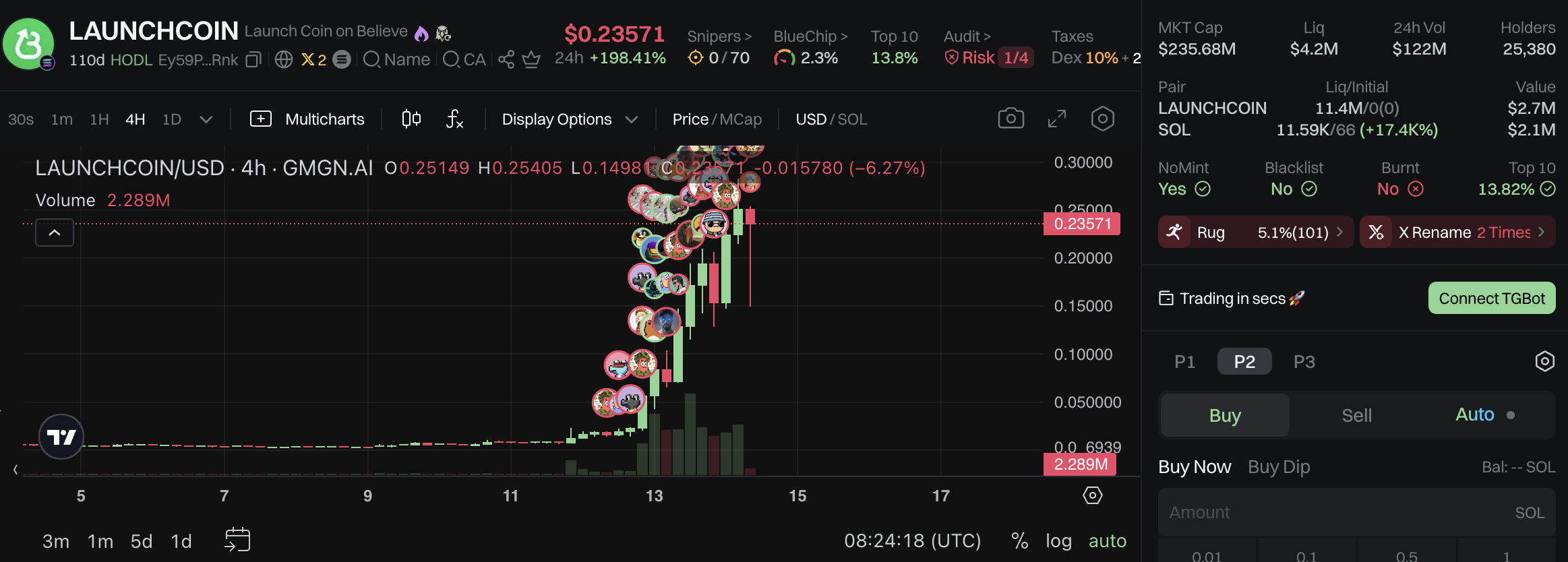 ข้อมูลจาก GMGN เผยว่า LAUNCHCOIN มีสภาพคล่องต่ำ โดยมีเพียง 4.2 ล้าน USD ในพูลสภาพคล่อง ขณะที่มูลค่าตลาดพุ่งเกิน 230 ล้าน USD ความแตกต่างนี้อาจทำให้นักลงทุนขายโทเคนขนาดใหญ่ได้ยาก นำไปสู่ความเสี่ยงจากการลื่นไถลที่อาจเกิดขึ้นได้