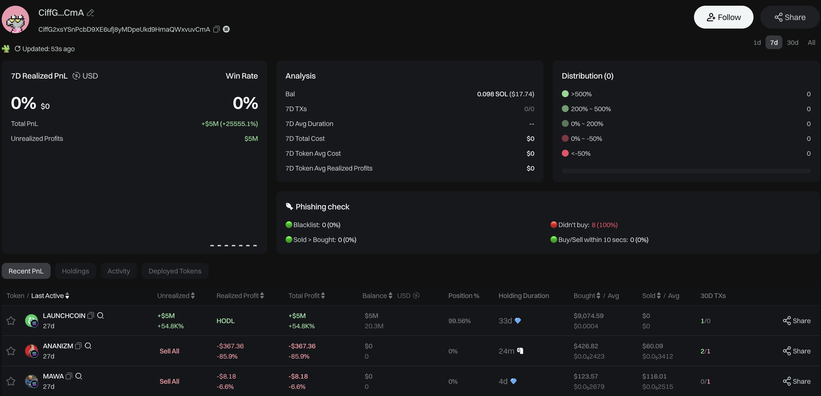 ในขณะเดียวกัน วาฬอีกตัวหนึ่ง ลงทุน 367,000 USD เพื่อซื้อโทเค็น LAUNCHCOIN จำนวน 17.66 ล้านโทเค็นเมื่อสามเดือนที่แล้วเมื่อราคายังเกือบเป็นศูนย์ การลงทุนนี้ได้ให้กำไรที่ยังไม่เกิดขึ้นจริงกว่า 2.3 ล้าน USD แล้ว