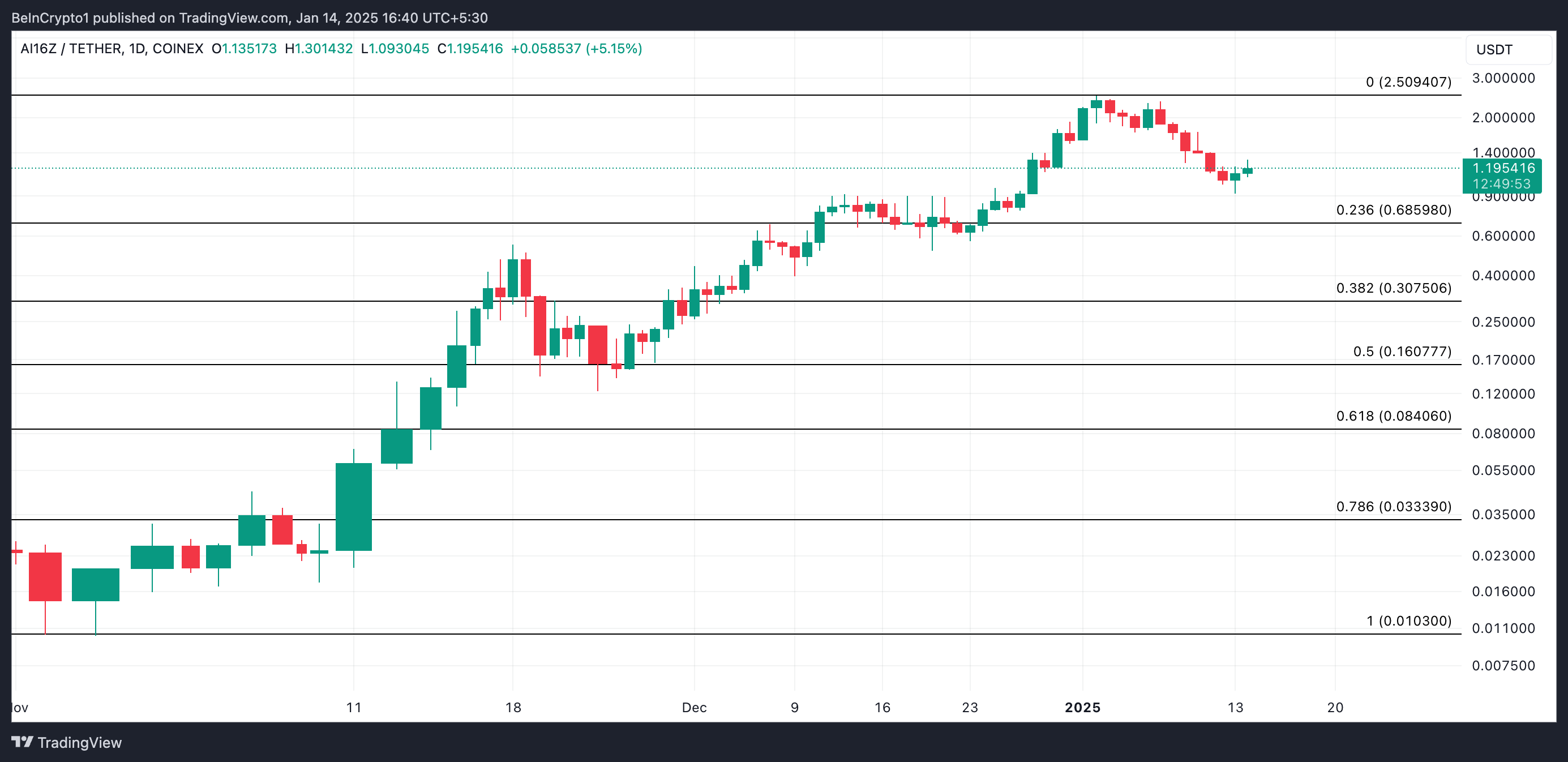 สิ่งนี้เกิดขึ้นกับ AI16Z ซึ่งมูลค่าได้เพิ่มขึ้น 16% ในช่วง 24 ชั่วโมงที่ผ่านมา หากแรงบวกยังคงอยู่ ราคาของมันอาจกลับไปที่จุดสูงสุดตลอดกาลที่ 2.50 USD อย่างไรก็ตาม การเปลี่ยนแปลงในแนวโน้มตลาดจะทำให้ทฤษฎีบวกนี้เป็นโมฆะ ในกรณีนั้น ราคาของ AI16Z อาจลดลงไปที่ 0.68 USD