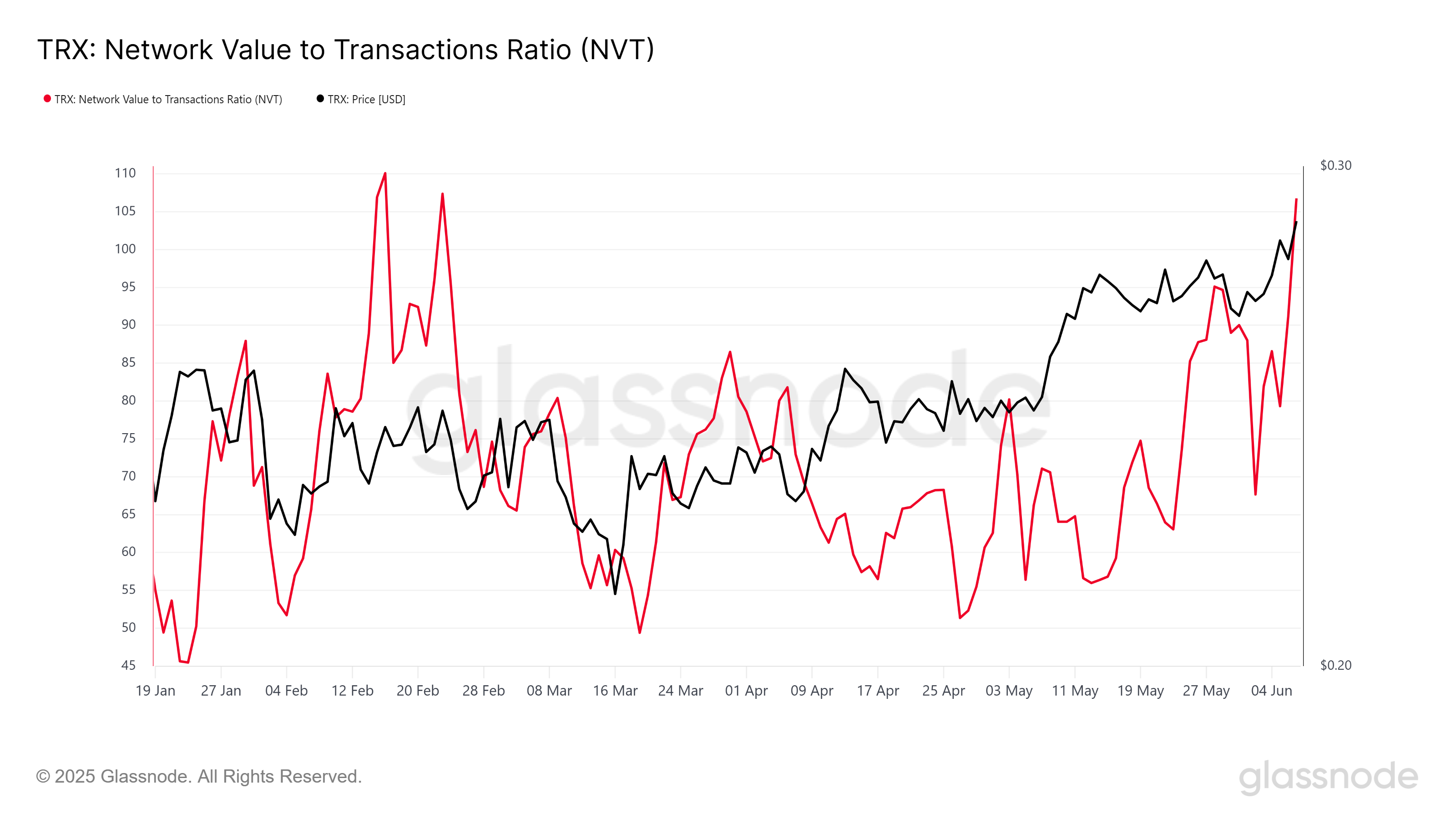 การเพิ่มขึ้นของ NVT มักบ่งชี้ว่ามูลค่าตลาดของสินทรัพย์กำลังแซงหน้ากิจกรรมการทำธุรกรรม ซึ่งบ่งบอกถึงการประเมินมูลค่าสูงเกินไป ใน กรณีของ TRX การเพิ่มขึ้นของ NVT นี้เป็นสัญญาณเตือนที่อาจเกิดขึ้น