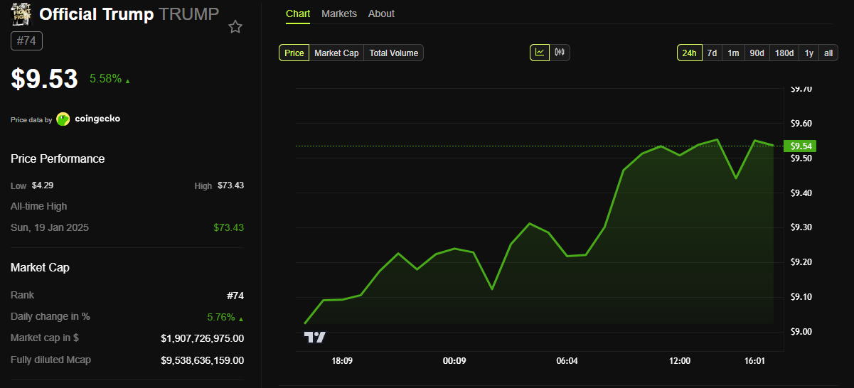 TRUMP memecoin พุ่งขึ้น 9% ในวันอังคาร หลังจากที่ลดลงอย่างต่อเนื่องมาหลายเดือน การพุ่งขึ้นนี้เกิดขึ้นหลังจากพิธีเปิดตลาด Nasdaq ที่มี Eric Trump และผู้บริหารจาก World Liberty Financial (WLFI) และ ALT5 Sigma เข้าร่วม