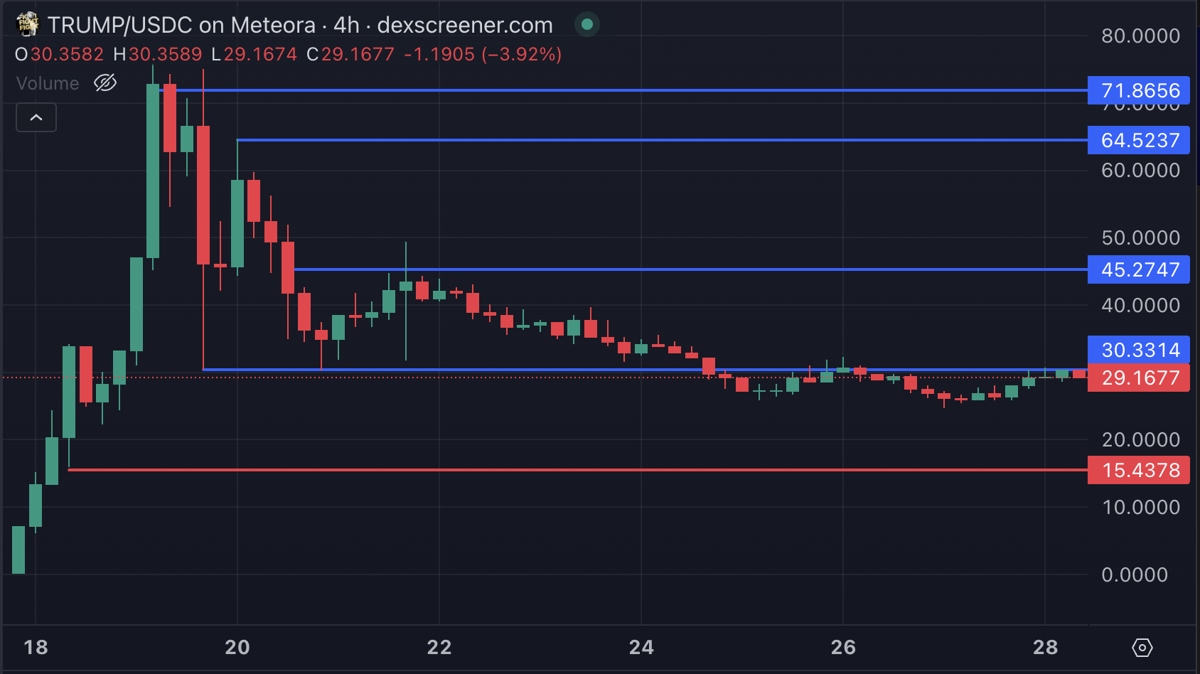 ราคาของ TRUMP เพิ่มขึ้น 10% ในช่วง 24 ชั่วโมงที่ผ่านมา แต่ยังคงต่ำกว่าระดับเดิม 20% ในสัปดาห์ที่ผ่านมา ยังคงรักษาชื่อเสียงในฐานะหนึ่งใน memecoins ที่ได้รับความสนใจมากที่สุด มูลค่าตลาดของมันอยู่ที่ 5.9 พันล้าน USD ลดลงอย่างมากจากจุดสูงสุดเกือบ 15 พันล้าน USD เมื่อวันที่ 19 มกราคม