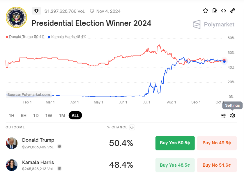 ตามข้อมูลจาก Polymarket Trump มีโอกาสชนะ 50.4% ในขณะที่อัตราของ Harris อยู่ที่ 48.5% นี่คือการแข่งขันที่ใกล้เคียงที่สุดที่แพลตฟอร์มนี้เคยเห็นมาตั้งแต่กลางเดือนกันยายน ซึ่งเน้นย้ำถึงความไม่แน่นอนที่ล้อมรอบการเลือกตั้งที่กำลังจะมาถึง