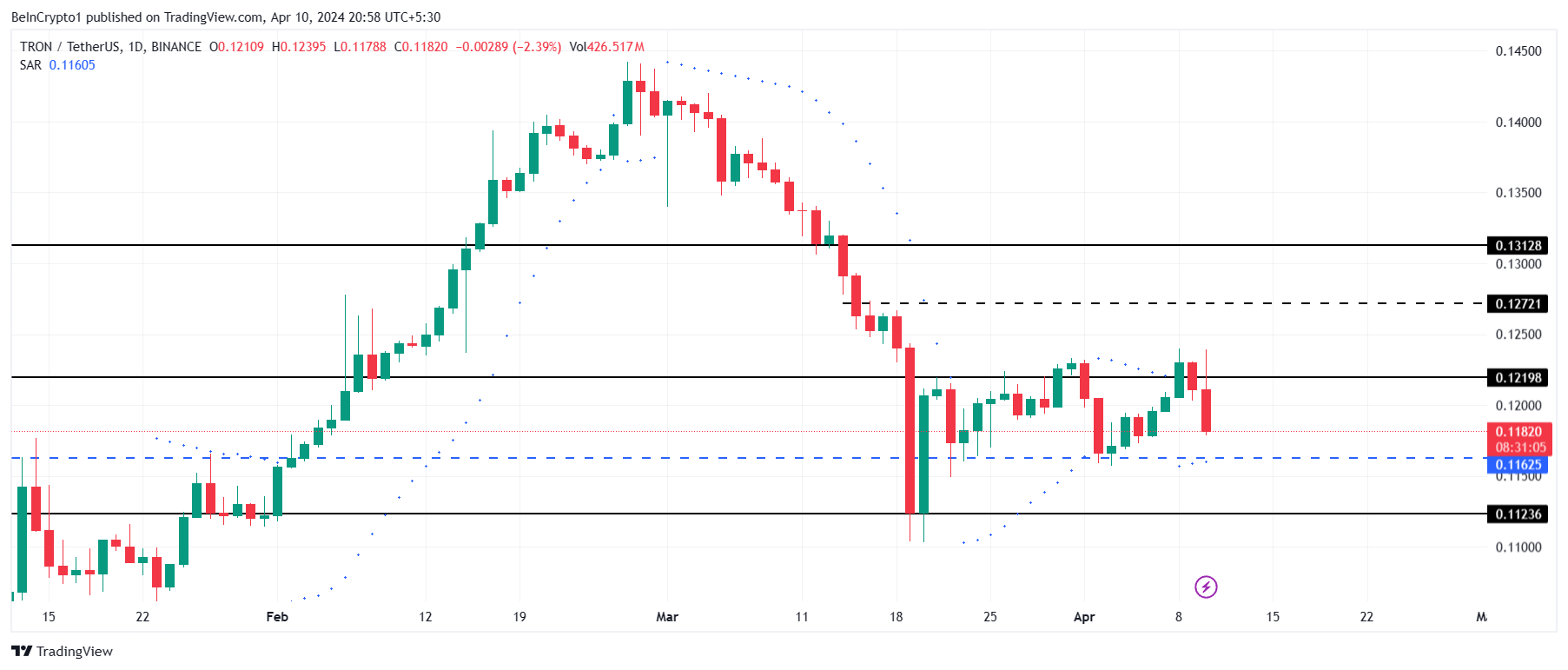 อย่างไรก็ตาม การทะลุ $0.121 เป็นเรื่องยากสําหรับราคาของ TRX ความล้มเหลวในการทําเช่นเดียวกันเป็นครั้งที่สามมีแนวโน้มที่จะผลักดัน TRX ให้ต่ํากว่า 0.116 ดอลลาร์ สิ่งนี้จะทําให้ผลลัพธ์ขาขึ้นเป็นโมฆะ โดยส่ง altcoin ไปที่ $0.112