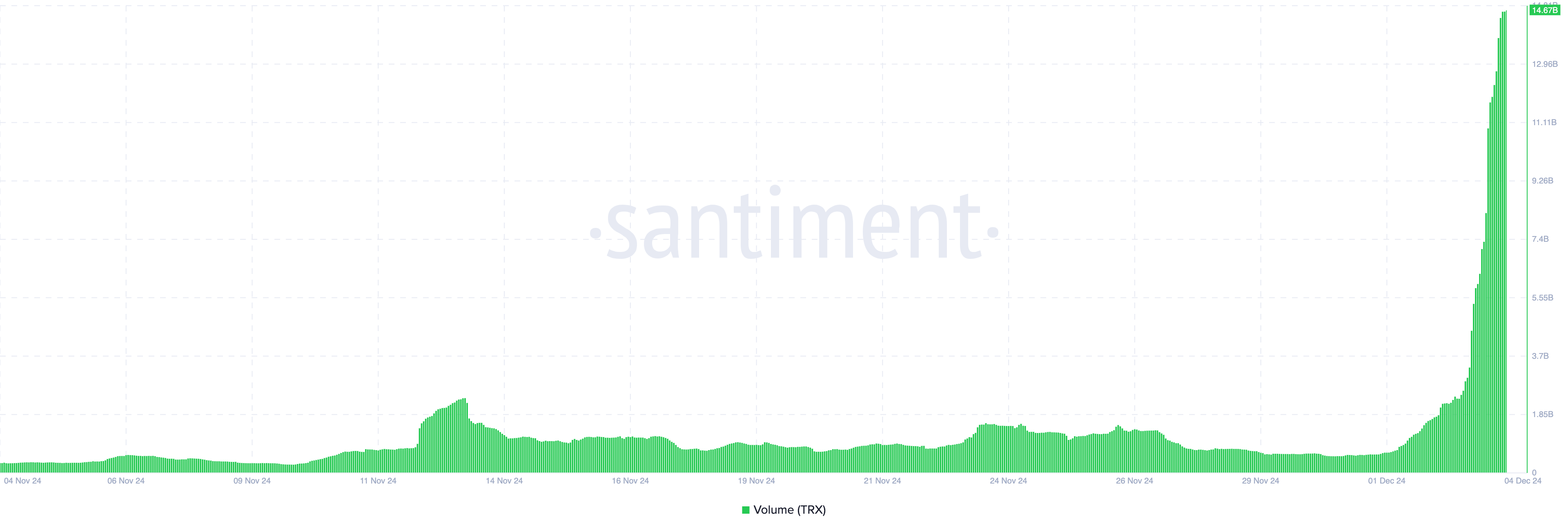 การเคลื่อนไหวที่ระเบิดนี้เกิดขึ้นหลังจากคำกล่าวที่กล้าหาญของผู้ก่อตั้ง Tron ชื่อ Justin Sun ซึ่งประกาศเมื่อวันที่ 2 ธันวาคมผ่าน X ว่า TRX คือ XRP ตัวถัดไป กระตุ้นการคาดการณ์และความตื่นเต้นของนักลงทุน หลังจากการพัฒนา ข้อมูลจาก Santiment แสดงให้เห็นว่าปริมาณ TRX เพิ่มขึ้นเป็น USD 14.67 พันล้าน