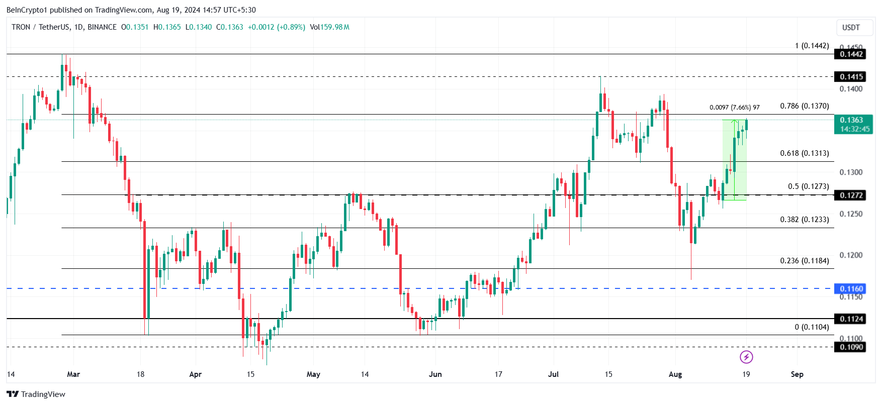 สิ่งนี้อาจพิสูจน์ได้ว่าเป็นอันตรายต่อโทเค็นและนักลงทุน ซึ่งทํากําไรได้อย่างต่อเนื่องในช่วงสองสามวันที่ผ่านมา ราคาของ Tron อยู่ในเส้นทางที่จะทะลุ 0.137 ดอลลาร์แล้ว และการทําเช่นนั้นจะทําให้เพิ่มขึ้นเป็น 0.144 ดอลลาร์
