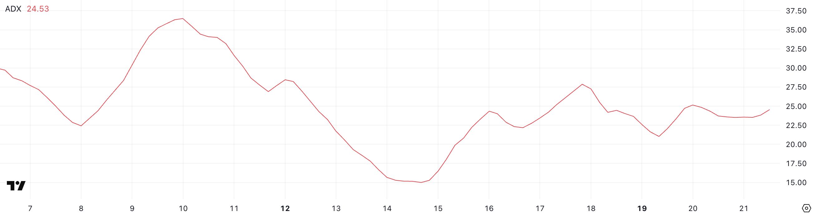 ค่า ADX ระหว่าง 20 ถึง 25 มักบ่งบอกถึงช่วงเริ่มต้นของแนวโน้ม และการเคลื่อนไหวเหนือ 25 จะยืนยันการเปลี่ยนแปลงทิศทางที่แข็งแกร่งขึ้น
