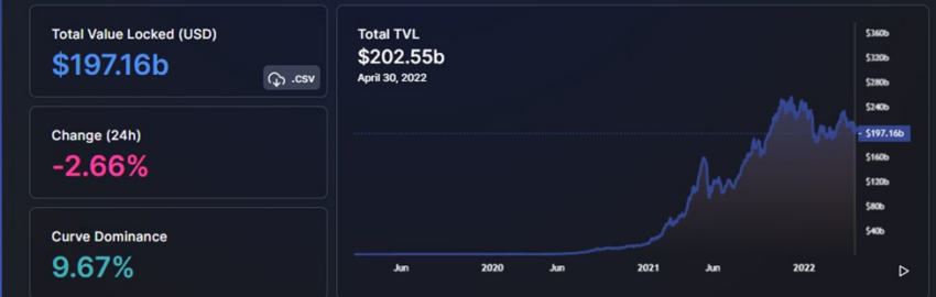 เมื่อวันที่ 1 เมษายน 2022 Curve TVL มีมูลค่าประมาณ 20.76 พันล้านดอลลาร์ เมื่อวันที่ 30 เมษายน พ.ศ. 2565 Curve TVL มีมูลค่าประมาณ 19,530 ล้านดอลลาร์