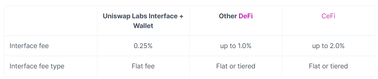 ผู้ใช้สามารถหลีกเลี่ยงค่าธรรมเนียมได้โดยใช้อินเทอร์เฟซอื่นเพื่อเข้าถึง Uniswap อย่างไรก็ตาม ธุรกรรมใดๆ ที่ดําเนินการบนเครือข่ายหลักและเครือข่ายเลเยอร์ 2 ที่รองรับจะมีค่าธรรมเนียมที่เพิ่มขึ้น