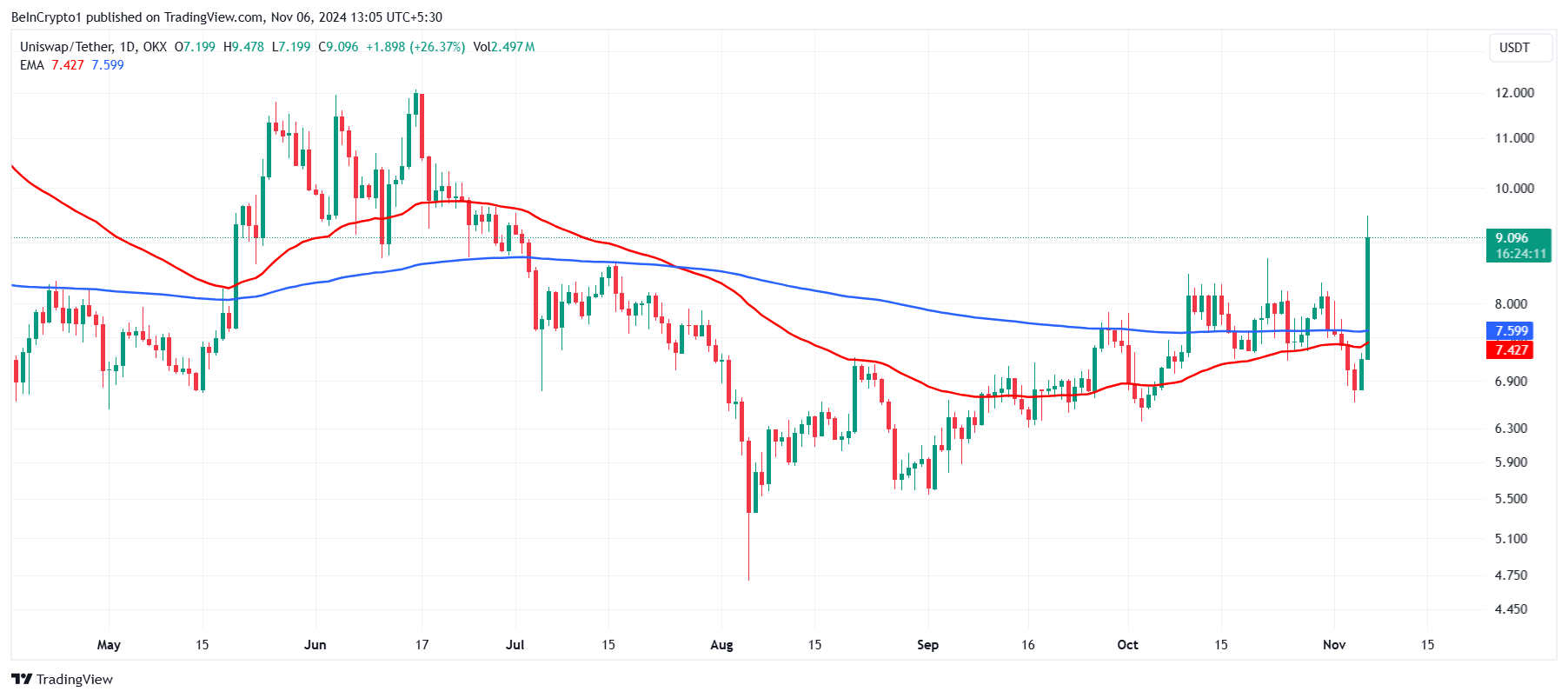 แรงกระตุ้นในภาพรวมสำหรับ Uniswap ชี้ไปที่การเติบโตที่อาจเกิดขึ้น เนื่องจากตัวบ่งชี้ทางเทคนิค เช่น ค่าเฉลี่ยเคลื่อนที่แบบเอ็กซ์โพเนนเชียล (EMAs) บ่งชี้ถึงการเกิด Golden Cross ที่อาจเกิดขึ้นในไม่ช้า ปัจจุบัน Uniswap กำลังประสบกับ Death Cross ซึ่งเกิดขึ้นเมื่อสามเดือนก่อนเมื่อ EMA 50 วันตัดลงต่ำกว่า EMA 200 วัน ส่งสัญญาณถึงความเป็นหมี