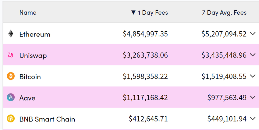 จากข้อมูลของ Crypto Fees Uniswap ได้รับค่าธรรมเนียมประมาณ 3.2 ล้านดอลลาร์ในช่วง 24 ชั่วโมงที่ผ่านมา เฉลี่ย 3.4 ล้านดอลลาร์ในช่วงสัปดาห์ที่ผ่านมา โปรโตคอลจัดการประมาณ 30% ของการซื้อขายทั้งหมดในภาคการเงินแบบกระจายอํานาจ
